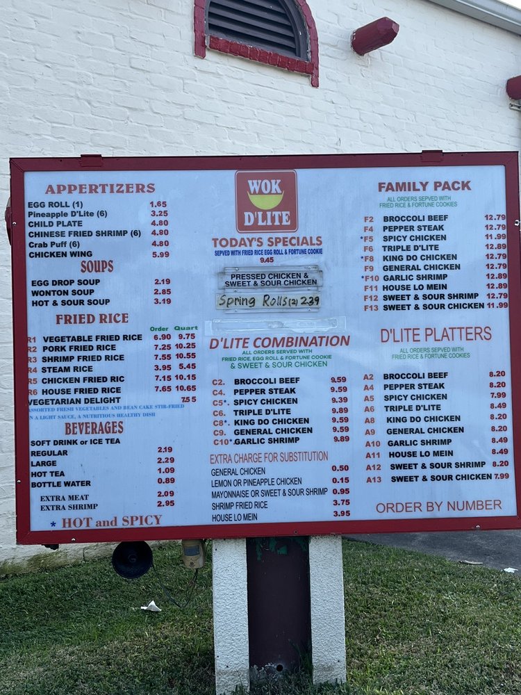 Wok D'lite is a beloved Chinese restaurant in Lake Charles, Louisiana, known for its convenient drive-thru option and affordable prices. Customers rave about the delicious egg rolls, flavorful hot and sour soup, and crave-worthy crab rangoons. The establishment's famous Friday special, crispy fried chicken, is a must-try for locals and visitors alike. With fast service, indoor seating, and central location, Wok D'lite has been a go-to spot for over 30 years. Whether you're in the mood for traditional lo mein or the best fried rice in town, Wok D'lite delivers on flavor, value, and friendly service. Experience the taste of authentic Chinese cuisine at Wok D'lite.